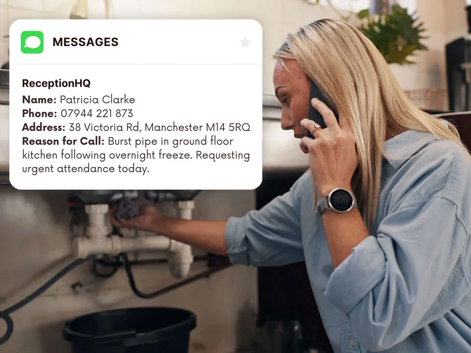 Whether you’re dealing with a burst pipe in a Victorian terrace, clearing a blocked drain in a commercial property or repairing central heating across multiple sites, answering every inbound call simply is not possible. But customers who reach voicemail don’t wait, particularly when they are dealing with an urgent situation. ReceptionHQ answers in your business name, captures every job detail accurately and delivers your messages instantly so you can follow up between jobs without losing a single lead.